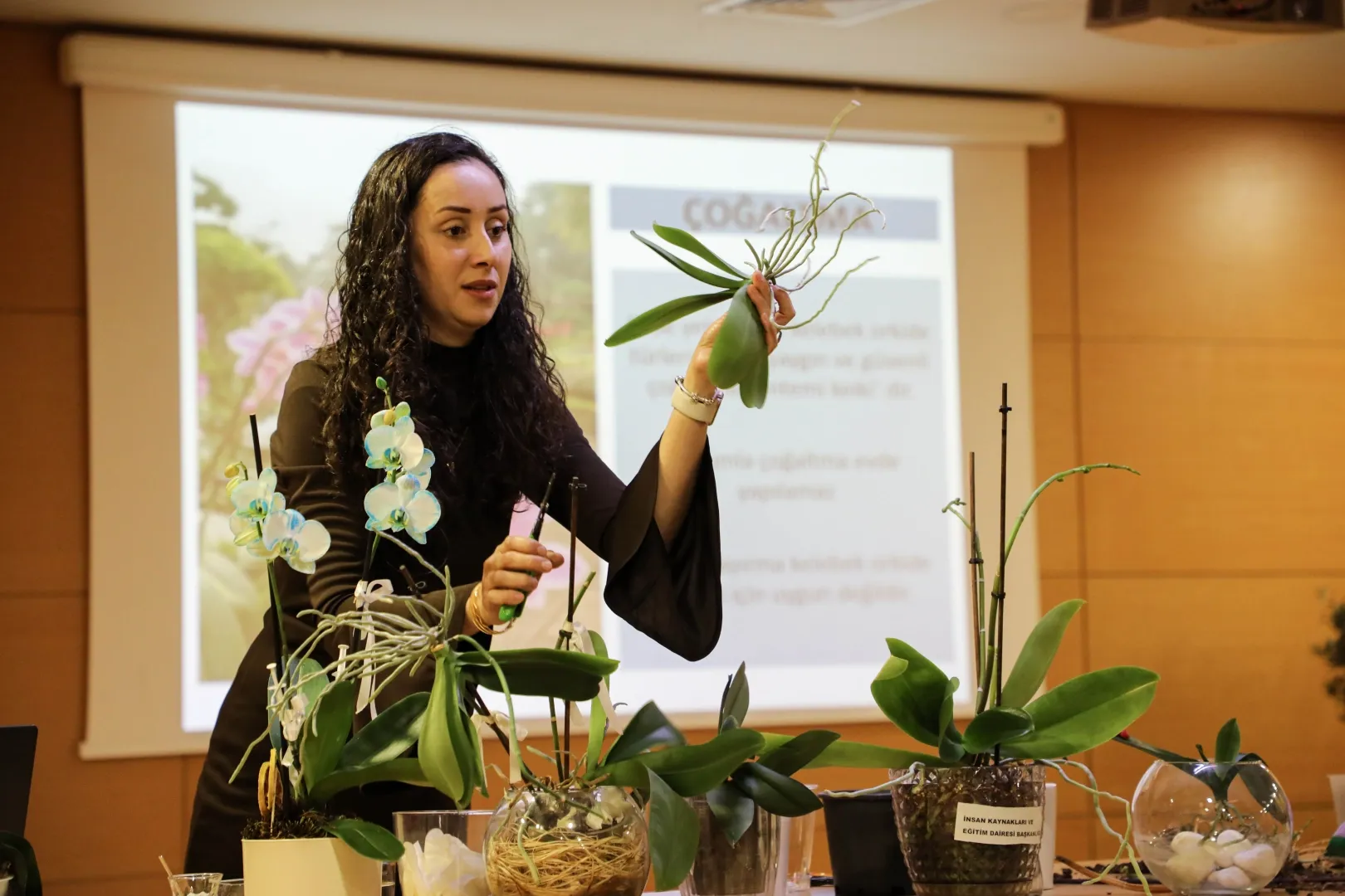 Yoğun ilgi ile karşılanan eğitimde, orkidelerin sulama sıklığı ve yöntemleri, uygun ışık koşulları, ortam sıcaklığı, nem dengesi, saksı ve toprak seçimi gibi başlıklarda kapsamlı bilgiler paylaşıldı.