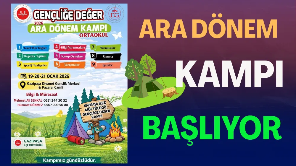 Kamp programına ilişkin Gazipaşa İlçe Müftülüğü Gençlik Koordinatörlüğü tarafından yapılan açıklamada, “Gençliğe Değer Ara Dönem Kampı ile ortaokul öğrencilerimize değerler eğitimi, dini bilgiler ve sosyal etkinlikler sunarak manevi gelişimlerine katkı sağlamayı amaçlıyoruz. Bu tür programlar çocuklarımızın dini ve ahlaki gelişiminde önemli bir rol oynamaktadır. Şimdiden tüm katılımcılarımıza başarılı ve verimli bir kamp dönemi diliyoruz” ifadelerine yer verildi.> Vildan RENDE